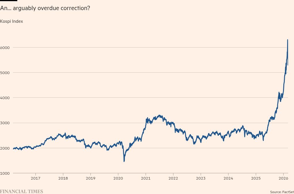 It’s never going to be simple to diagnose the source of a drop this sharp — and it’s worth noting that despite slamming into the circuit-breakers and entering correction territory today, the Kospi is still absolutely on smoke over the past year or so (good stuff from Rob on this over on Unhedged earlier this week):