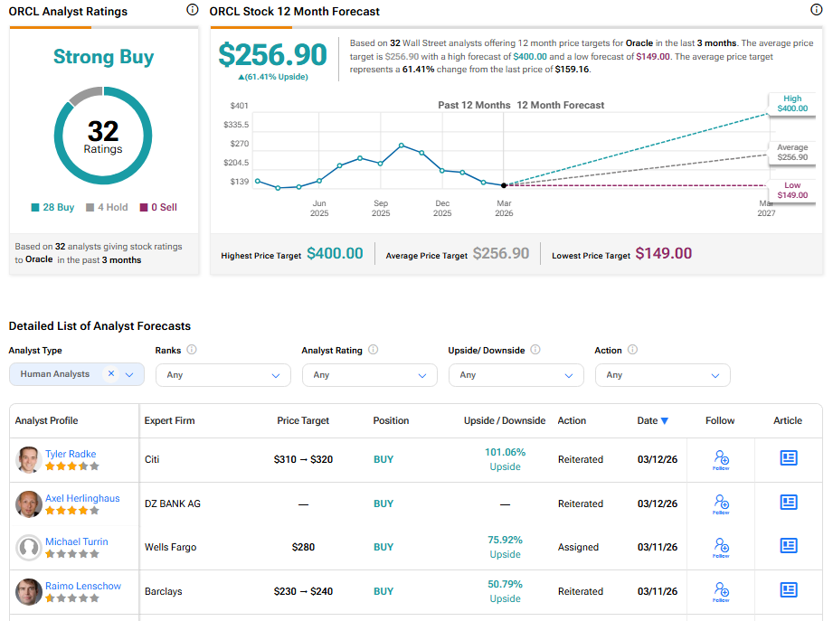 Overall, Wall Street has a Strong Buy consensus rating on ORCL stock, based on 28 Buys and four Holds assigned in the last three months. The average Oracle stock price target of $256.23 implies an upside of 57% from current levels.