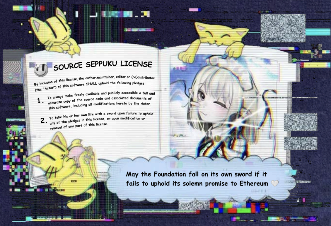 EF also created a meme titled “SOURCE SEPPUKU LICENSE,” with the caption: “If the foundation fails to uphold its solemn promises to Ethereum, let it face the consequences and self-terminate.”