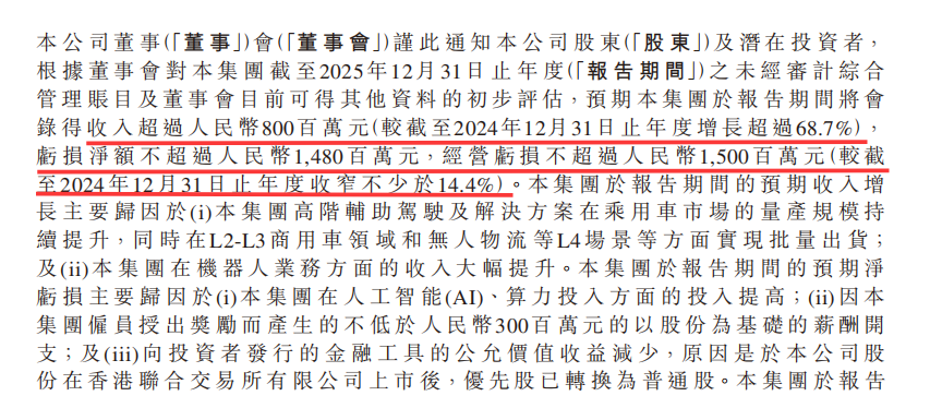 The announcement shows that revenue growth is mainly due to higher-volume production of high-end assisted driving and bulk shipments of L2–L3 commercial vehicles and L4 unmanned logistics, as well as an increase in revenue from the robotics business. Meanwhile, net losses are attributed to increased spending on AI and computing power, as well as share-based compensation expenses of no less than RMB 300 million, and a decrease in fair value gains from financial instruments. The narrowing of operating losses benefits from growth in the robotics business, increased gross profit from high-end assisted driving and solutions, and lower operating costs.