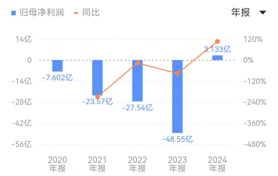 However, the company’s operating situation is still not optimistic. Even though operating loss has narrowed, the loss level remains high. Looking back at historical data, in 2024 it appeared to achieve net profit of RMB 313 million, but in reality it was a one-off gain driven by changes in the fair value of financial instruments; after excluding that, operating profit was still negative.