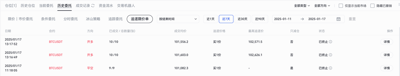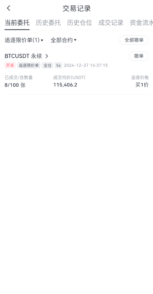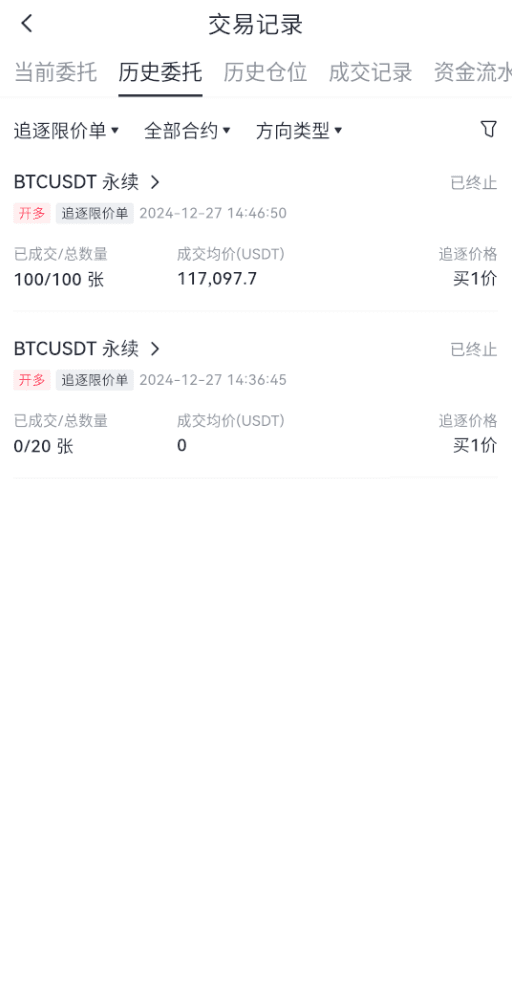 已完成或已撤销的追逐限价单都会进入【历史委托】中,可点击交易页面下方“仓位”最右侧的“账单”图标,可以查看历史委托记录。下图为追逐限价单历史委托信息: