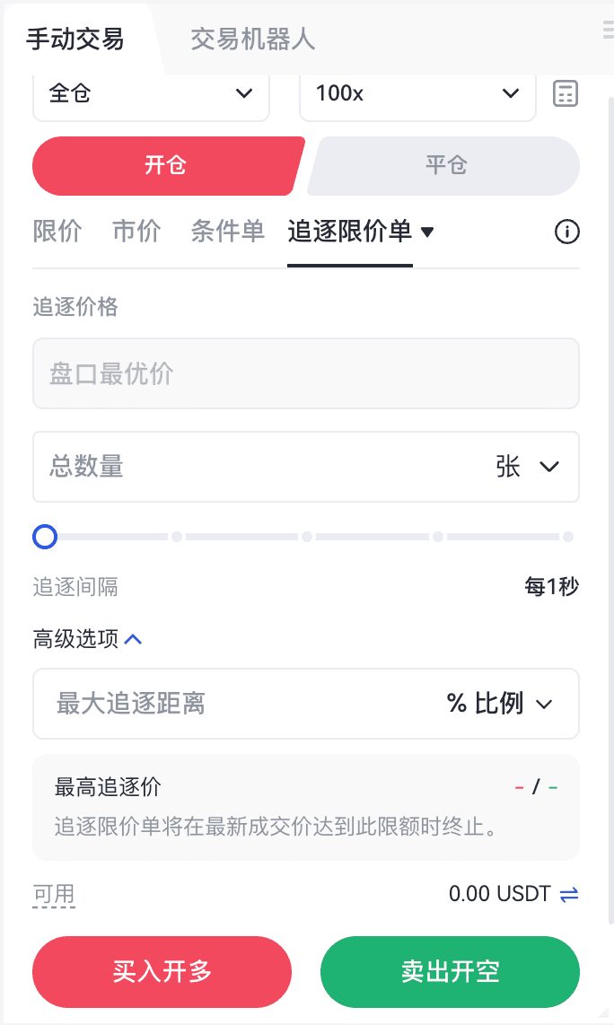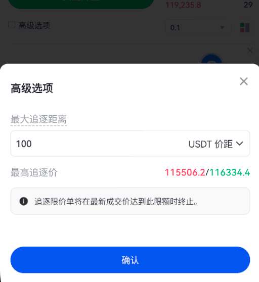最大追逐距离可设置为数值或百分比。一旦最新价格达到预设阈值,追逐限价单将自动取消。