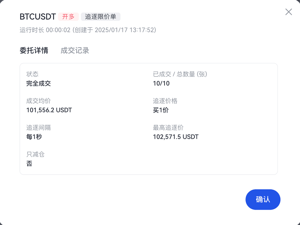 运行中和已结束的追逐限价单,均支持查看委托详情。用户在当前委托或历史委托中点击追逐限价单后方的详情按钮,可展示追逐限价单详情页面,支持查看追逐限价单的状态、参数信息以及成交明细。