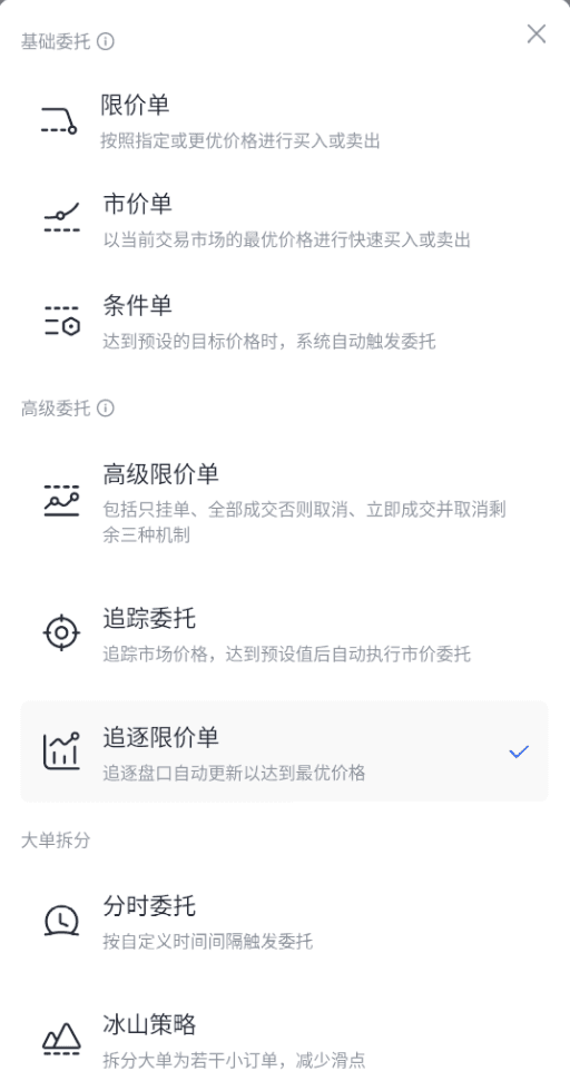 追逐限价单是一种以最优买价或卖价下达的限价单,会根据不断变化的市场行情动态调整入场价格,直至订单成交、取消或达到最大追逐距离。