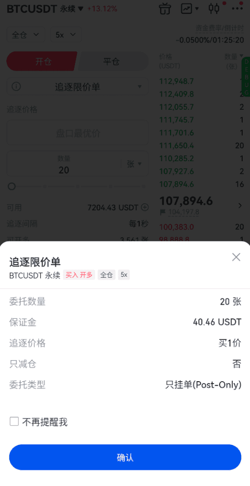 追逐限价单适用于所有永续合约交易(包括USDT本位和BTC本位)。提交追逐限价单后系统会按照当前方向盘口一价即时更新委托价格,使得订单较快成交的同时还能节省手续费,我们来举例说明。