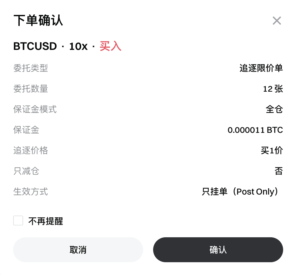 小明想要买入1BTC,则使用追逐限价单下单;