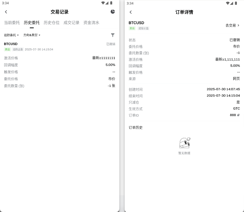 已完成或已撤销的追逐限价单都会进入【历史委托】中,可在历史委托中点击追逐限价单,查看追逐限价单的历史记录。下图为追逐限价单历史委托信息: