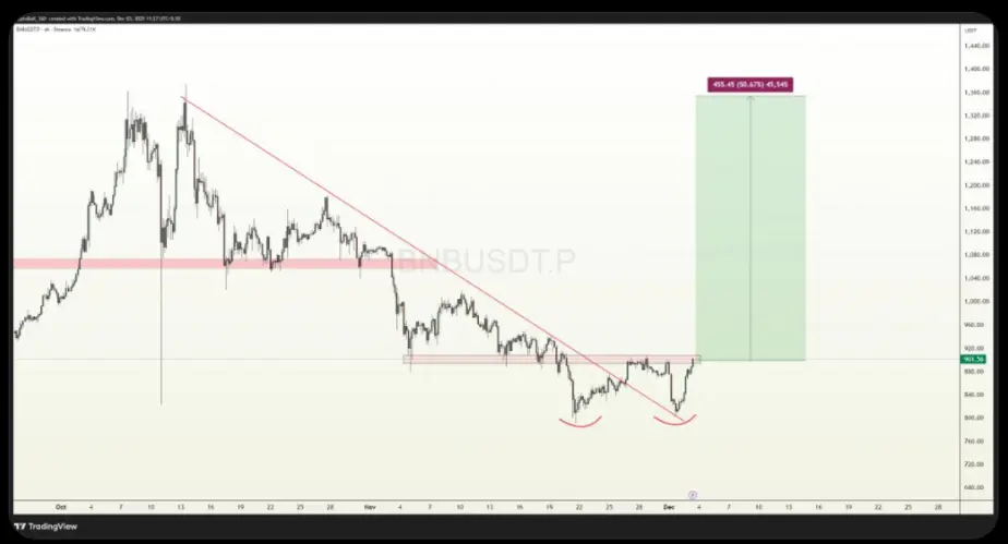 Segundo o objetivo de medição do padrão de cunha, a BNB poderá apontar para a zona dos 1.100–1.115 USD em dezembro, desde que o atual ímpeto de subida se mantenha. Mais otimista ainda, o trader CryptoBull_360 espera que a BNB possa atingir os 1.300 USD ou mais.