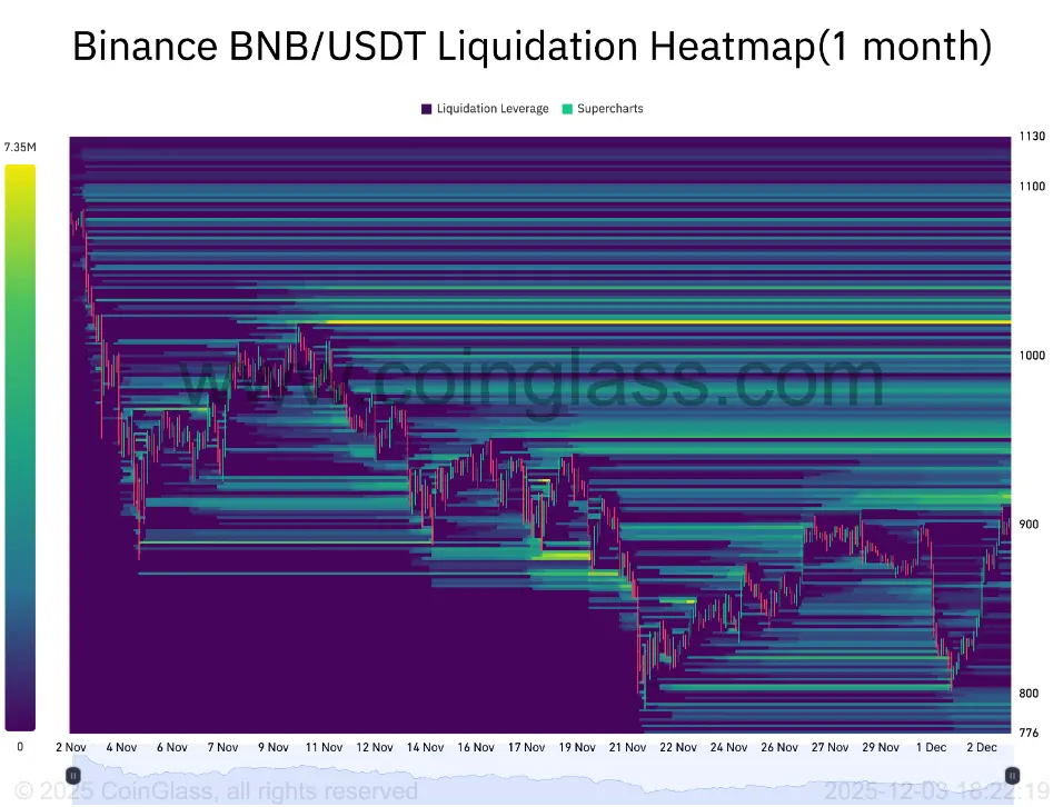 O mapa de liquidações da BNB no CoinGlass mostra cerca de 112,28 milhões de USD em posições curtas alavancadas concentradas na zona dos 1.020 USD – um sinal de que o preço pode ser atraído para esta região em dezembro.