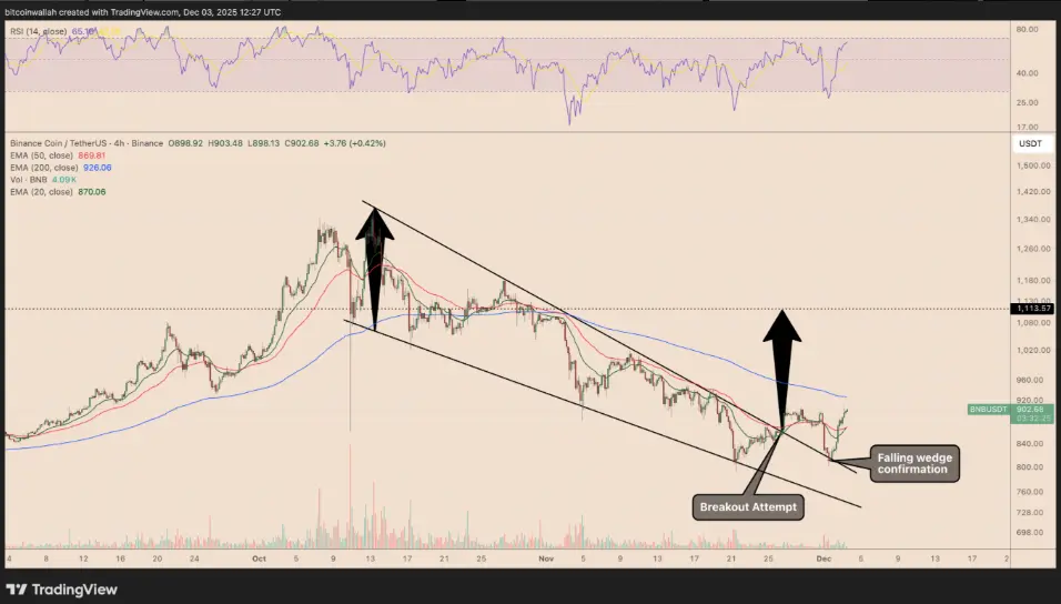A BNB registou recentemente uma importante fuga técnica ao sair de um padrão de cunha descendente que durou várias semanas — uma estrutura que geralmente sinaliza uma potencial inversão bullish após uma forte fase de vendas.