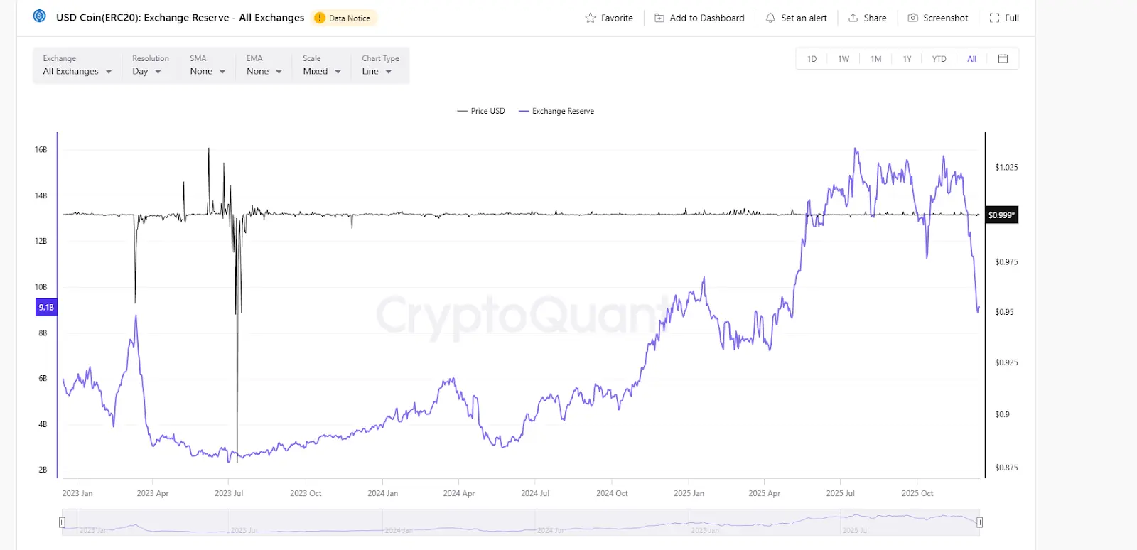 Por outro lado, o USDC apresenta uma situação completamente diferente. Desde o final de novembro, houve uma saída massiva de USDC das exchanges, com o estoque caindo de 15 bilhões para cerca de 9 bilhões de dólares, uma redução de 40%. Como uma stablecoin regulada líder, seus principais usuários são empresas americanas e fundos regulados. Eles representam o setor institucional do mercado. Atualmente, esse grupo está claramente acelerando sua saída.