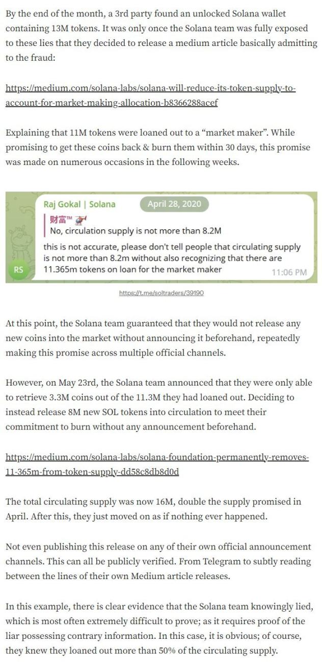 No entanto, a verdade feia é que, em 2020, a equipe Solana mentiu sobre a oferta circulante. Mesmo que esses números não sejam mais relevantes para o mercado atual, eles são, sem dúvida, uma mancha na história de Solana. Por uma questão de total transparência, elaborei esta questão na minha crítica anterior, tendo inclusivamente anexado provas: