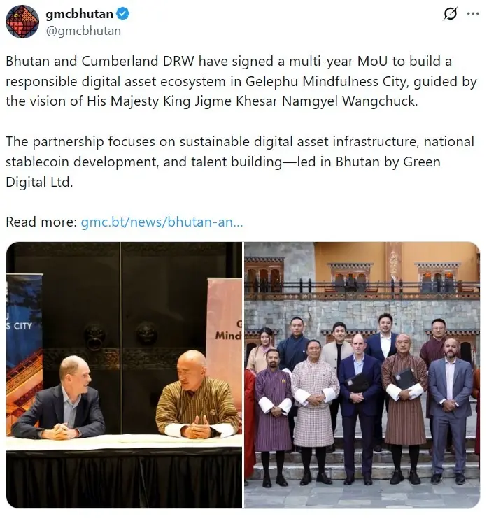 Butão assinou um memorando de entendimento (MoU) plurianual com a corretora de mercado de criptomoedas Cumberland DRW para colaborar na construção de infraestrutura de ativos digitais na Gelephu Mindfulness City (GMC), aprofundando a estratégia de criptomoedas de longo prazo e focada na sustentabilidade do país.