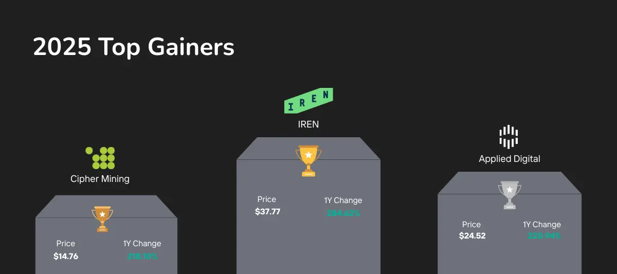 No topo da tabela estavam IREN, Applied Digital (APLD), e Cipher Mining (CIFR), cada um entregando mais de 200% de retorno no ano. Todas as três empresas tinham uma coisa em comum: acordos de hyperscaler de bilhões de dólares garantidos em 2025. Hut 8 (HUT) e TeraWulf (WULF), que também asseguraram contratos importantes de HPC, seguiram de perto com mais de 100% de retorno. Esses resultados destacam como os mercados de capitais cada vez mais recompensam mineiros que podem monetizar sua infraestrutura além do Bitcoin, especialmente através de parcerias com clientes hyperscale.