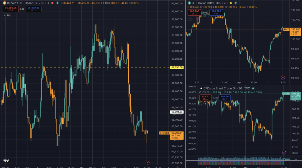 Depois, deslizou abaixo da faixa branca perto de $66.894. Uma vela de quebra de 30 minutos no início de 2 de abril acelerou a passagem do $68.000s para os $67.000s superiores, e as vendas subsequentes puxaram o preço para baixo, em direção aos $66.000s inferiores.
