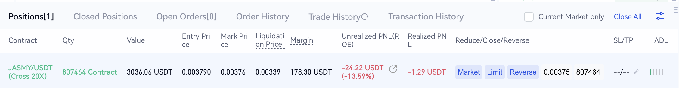 Как показано на скриншоте выше, нереализованный PNL этой позиции составляет 24,22 USDT, а маржа - 178,30 USDT. Следовательно, рентабельность инвестиций этой позиции составляет: