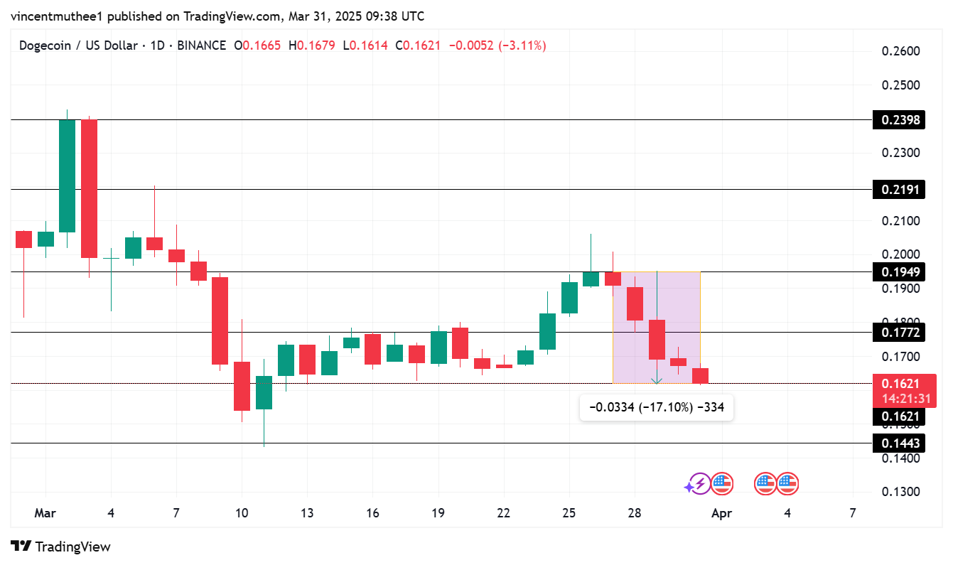 Цена DOGE в последнее время колебалась с медвежьей тенденцией, преобладающей на текущем рынке. Согласно дневному графику на TradingView, Dogecoin упал на 17.10% за последние пять дней. В настоящее время токен торгуется по цене $0.1621, при этом цена движется вниз, чтобы пробить уровень поддержки, установленный во время бокового движения цен.