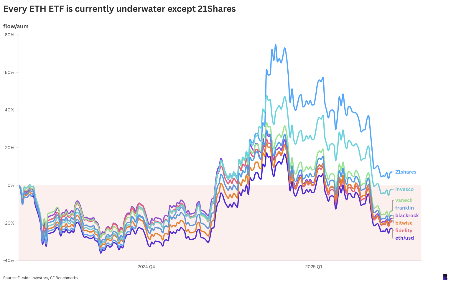 Возьмите CETH от 21Shares. Большинство его поступлений до сих пор произошли между сентябрем и ноябрем прошлого года, когда ETH иногда торговался за намного меньше $2,500.