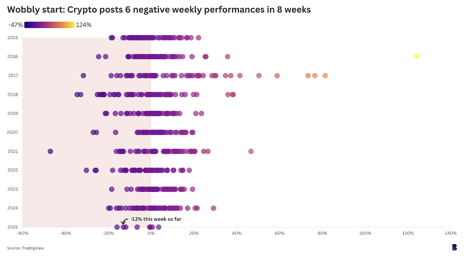 При поиске позитива есть один момент: мы сейчас входим в восьмую неделю 2025 года. Альткоин рынок - все монеты, которые не входят в топ-10 по капитализации, показал отрицательные доходы за все недели, кроме двух.