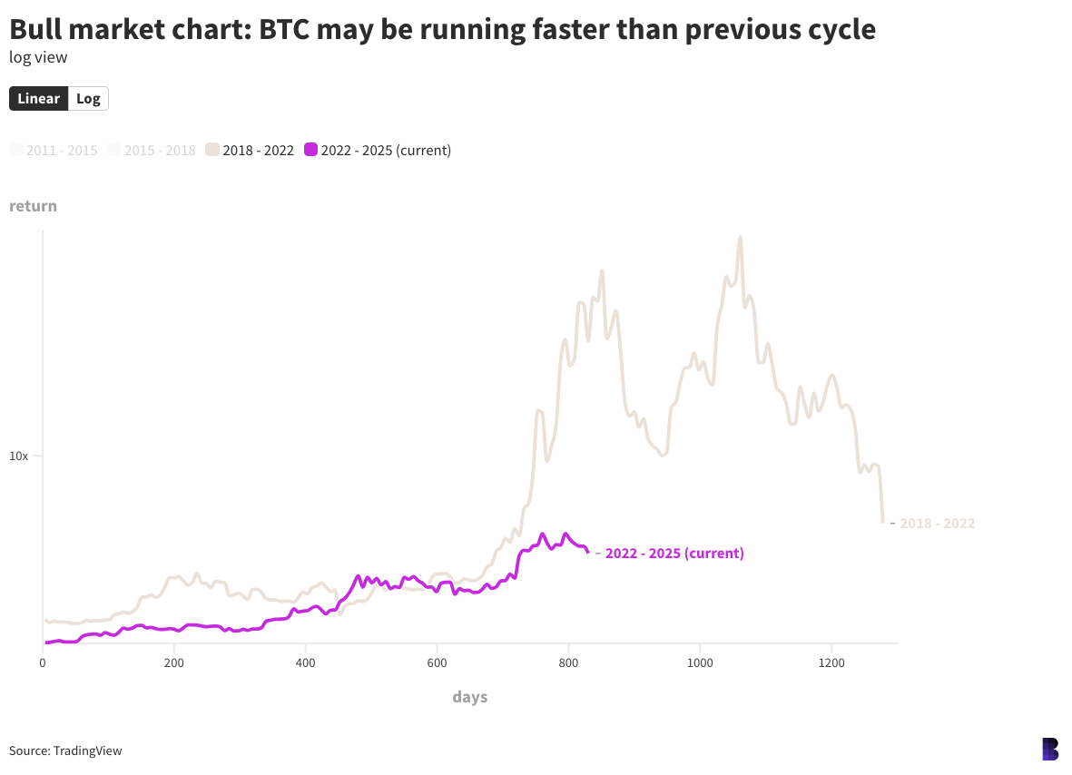Обычно я включаю график в логарифмическом масштабе, отображающий доходность с 2015 года. На этот раз график построен в линейном масштабе и сравнивает только этот цикл с предыдущим