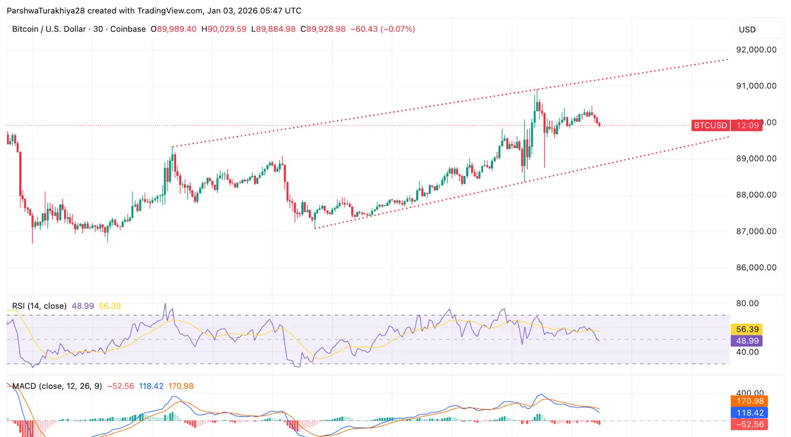 RSI находится около 49, что отражает нейтральные условия, а не бычью силу. MACD развернулся и немного ушел в отрицательную зону, показывая, что импульс на повышение быстро исчез после попытки в конце декабря достичь $91,000.