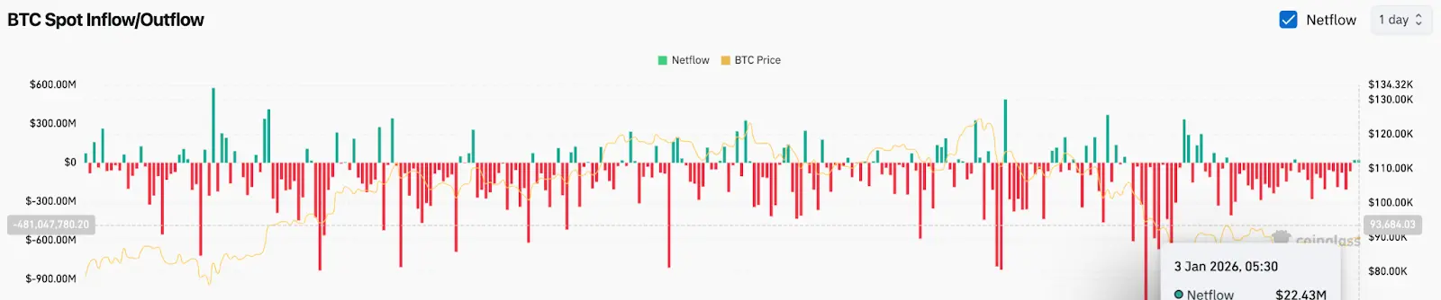 3 января чистые потоки кратковременно стали положительными на +$22,4 миллиона, при этом Bitcoin торговался около $89,959. Хотя эта цифра показывает снижение давления на продажу, она не меняет общего тренда. Входы за одну сессию после длительной дистрибуции обычно сигнализируют о стабилизации, а не о накоплении.