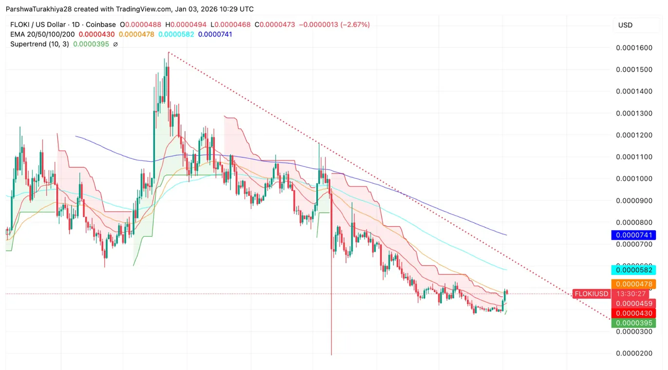 FLOKI торгуется по цене $0.000047, резко снизившись с пика мая 2025 года в $0.00016. Ежедневный график показывает цену ниже всех EMA на уровнях $0.000043/$0.000047/$0.000058/$0.000074 — медвежья структура. Supertrend на уровне $0.000039 обеспечивает поддержку.