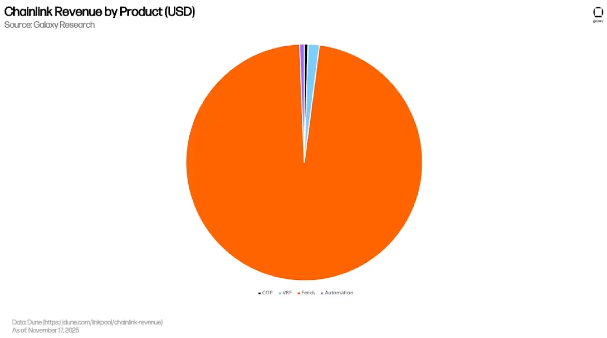 Но насыщение означает, что рост в DeFi для него уже ограничен. Согласно глубокому отчету Galaxy, около 97% доходов Chainlink (примерно 3.99 миллиарда долларов) приходится на Price Feeds, тогда как VRF (верифицируемые случайные числа для NFT и игр), Automation (автоматизация), CCIP — всего около 1.5%, 0.6% и 0.5% соответственно.