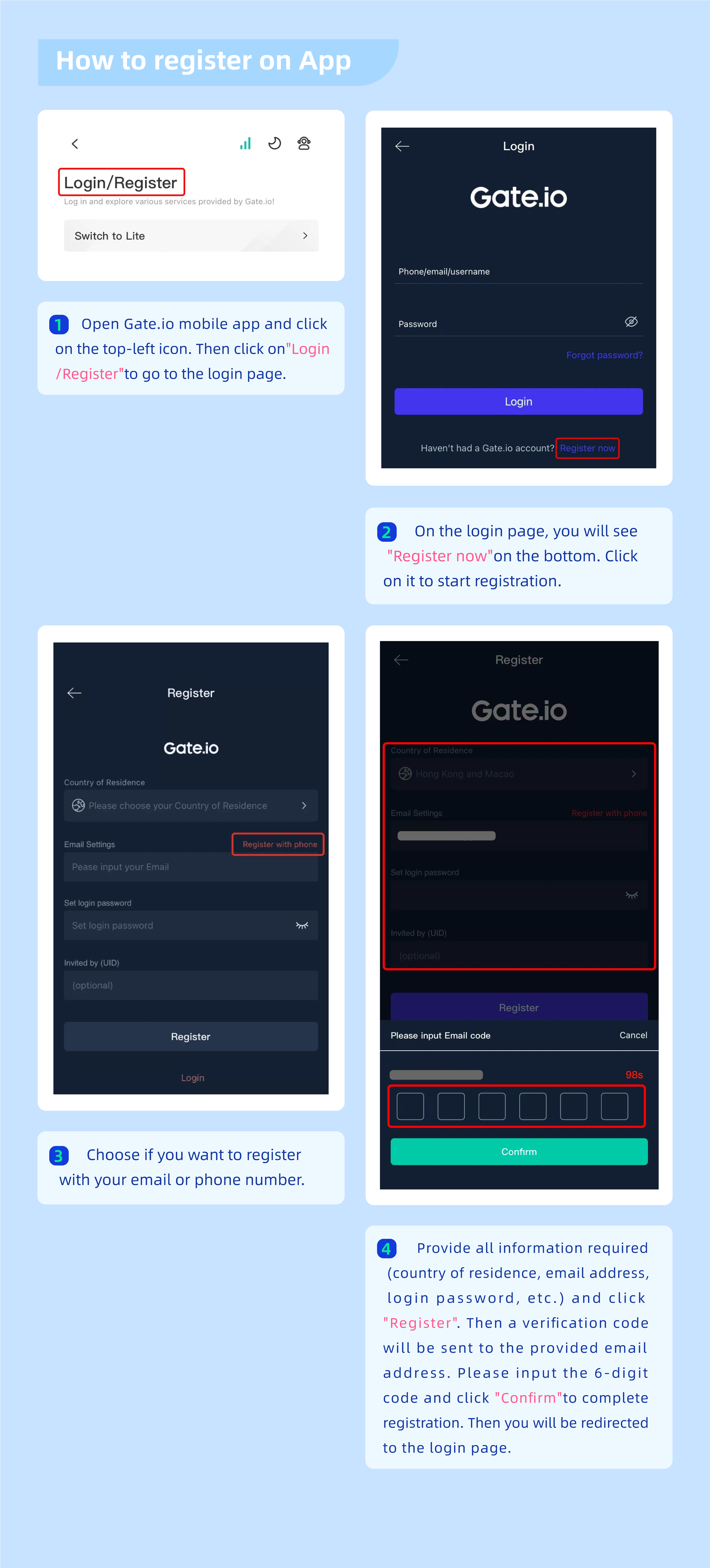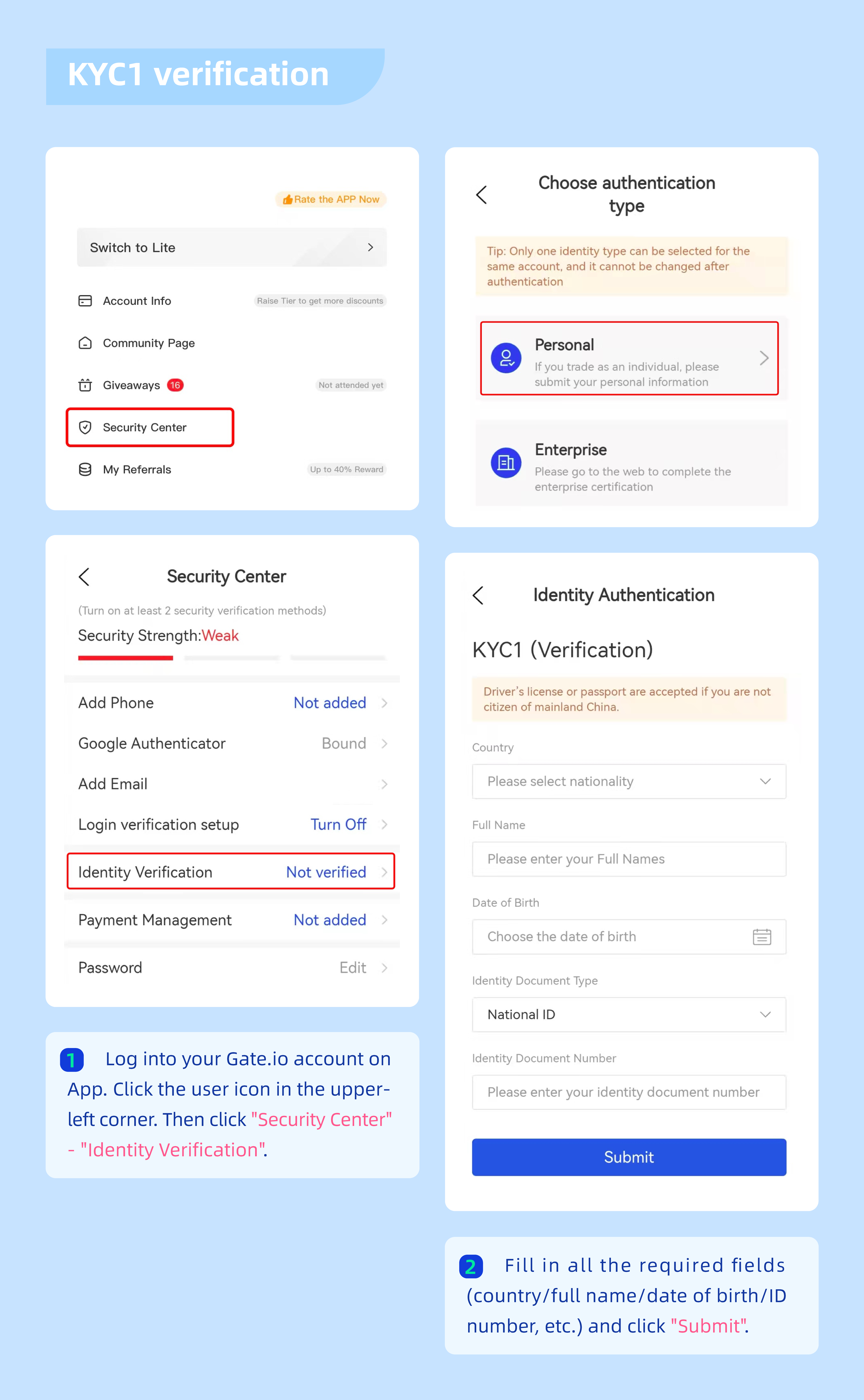 Gate, varlıklarınızın güvenliğini, kripto endüstrisinin yasal olarak uyumlu bir şekilde gelişmesini sağlamak ve dolandırıcılık, kara para aklama, şantaj ve diğer yasadışı faaliyetleri azaltmak için tüm kullanıcıların KYC Kimlik Doğrulaması almasını zorunlu kılar. Yalnızca KYC'yi tamamlayan kullanıcılar kripto para yatırabilir ve çekebilir, fiat para tradingi yapabilir ve Startup aboneliklerine katılabilir.