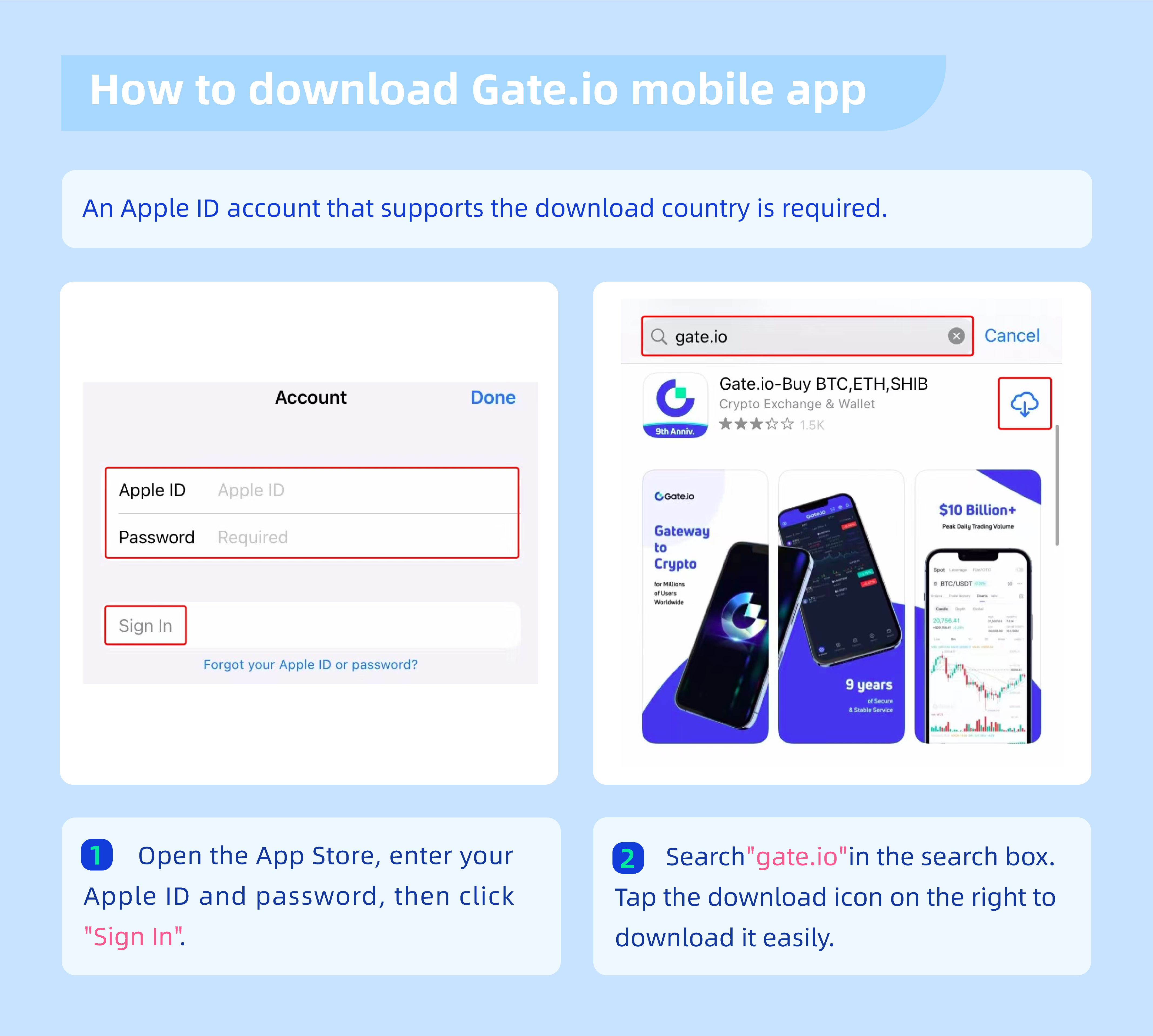 iOS için indirin: İndirme ülkesini destekleyen bir Apple ID hesabı gereklidir. Arama kutusuna "gate.io" yazın, ardından kolayca indirmek için " İndir" e dokunun.