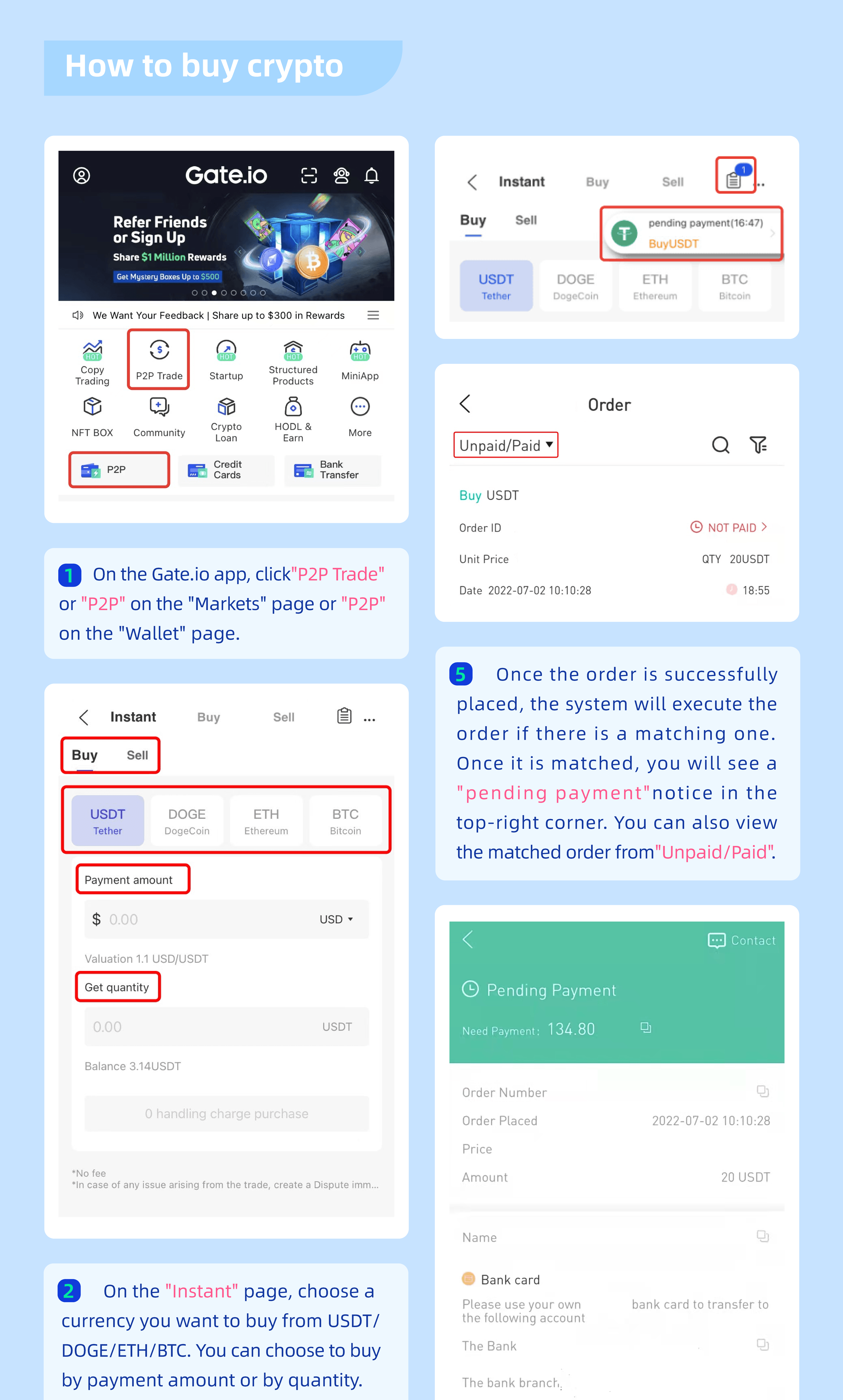"İndir" - "Kaydol" - "Doğrula" - "Kripto Satın Al" - "Trade Yap": 5 adım kolayca başlamanıza yardımcı olur.