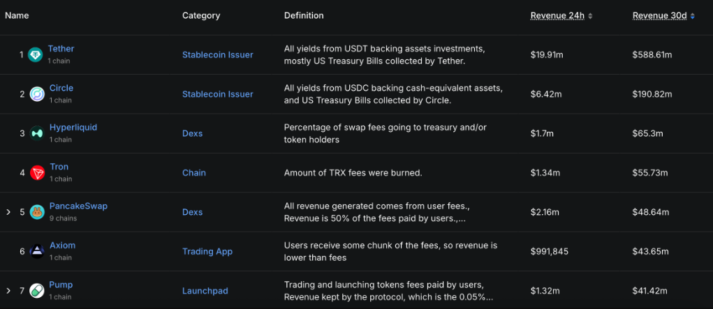 Tron remains one of the top revenue-generating crypto platforms with 55.7 million USD in the past 30 days, ranking behind Tether, Circle, and Hyperliquid. In the last 24 hours alone, this platform has generated 1.34 million USD in revenue.