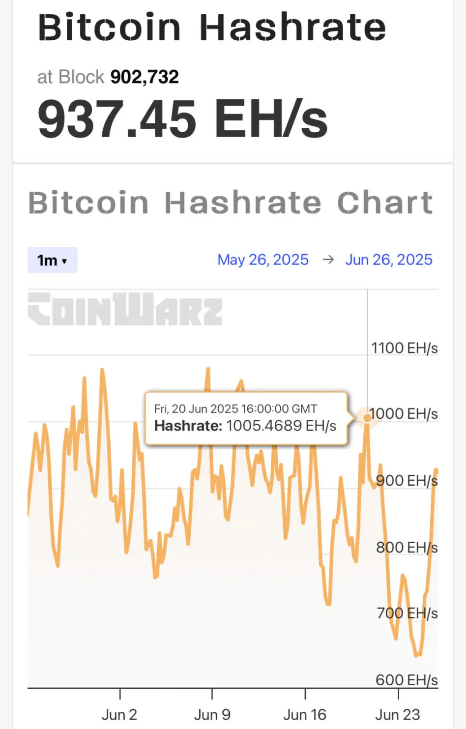 In the early hours of June 21, the U.S. launched the “Midnight Hammer” airstrikes against Iran’s nuclear facilities in Fordow, Natanz, and Isfahan, shaking not only the geopolitical landscape of the Middle East. At the same time, the average hash rate of the global Bitcoin network suddenly plummeted from about 1000 EH/s (exahashes per second) to below 650 EH/s. This seemingly unrelated digital fluctuation instantly sparked speculation: “Could Iran’s Bitcoin mines be hidden beneath the foundations of these nuclear facilities?”