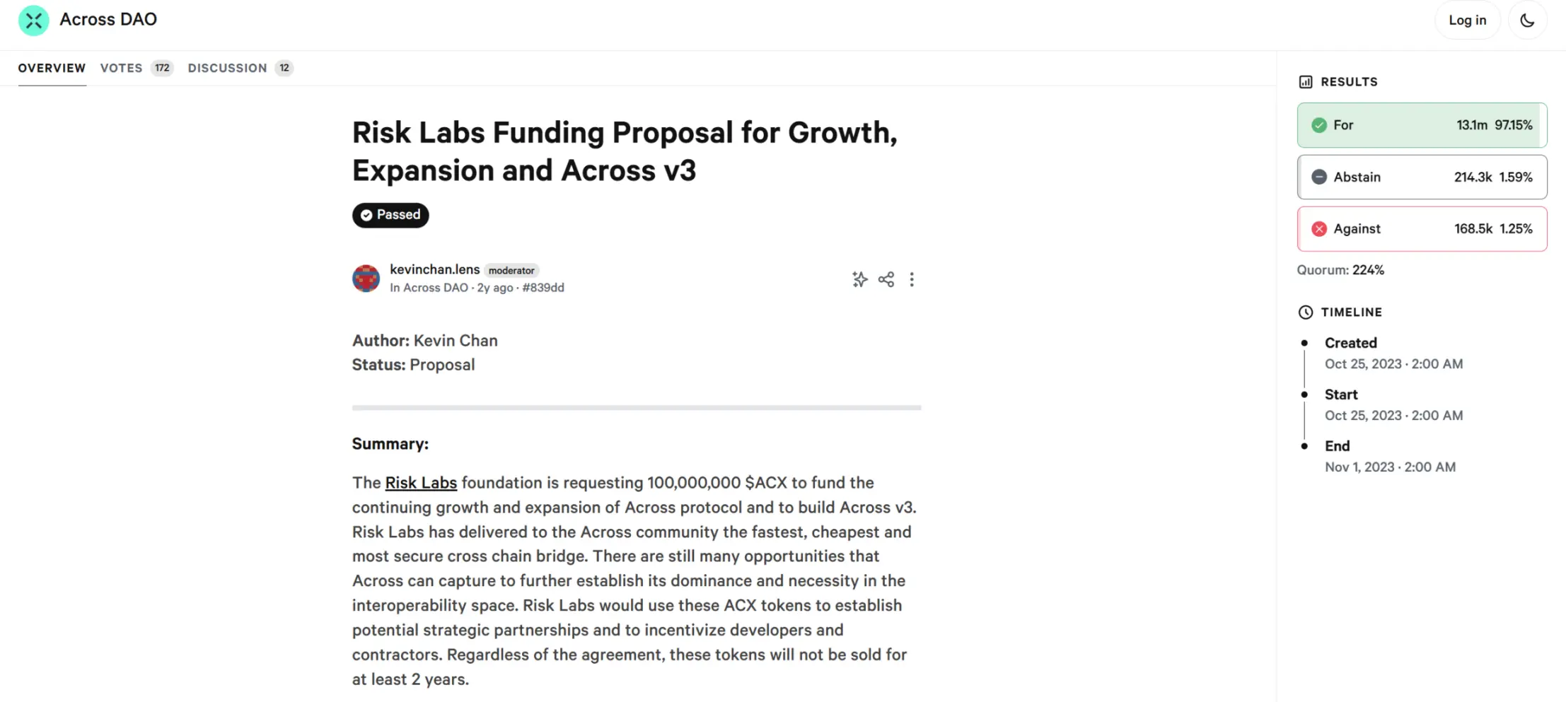 In addition, Ogle also specifically analyzed the detailed process. In October 2023, Kevin Chan, the head of the cross-chain protocol project, submitted a public proposal to the DAO, proposing to transfer 100 million ACX tokens (currently worth about 15 million USD) from the DAO to Risk Labs—the private profit-making company of the cross-chain protocol founder.