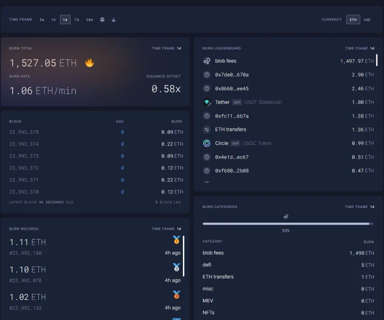 (2) Dencun (Dual Dimension + Blob Market Independence): Burn Execution Layer + Blob, L2 data written into blob will also burn ETH, but during low demand, the blob portion is almost 0.