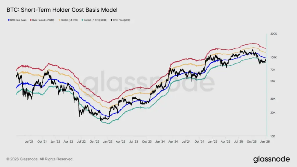 To truly see a sustained sentiment shift, we can use the Short Term Holder Cost Basis model as a reference. This is an on-chain indicator that shows the average price at which recent Bitcoin buyers (holding for less than about five months) acquired their coins. When price is above this level, recent buyers are generally in profile while below it increases selling pressure as they are at a loss. Given that it shows where recent buyers are positioned, this can be a very useful sentiment tool. Currently this level sits at $98.7K