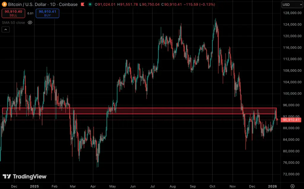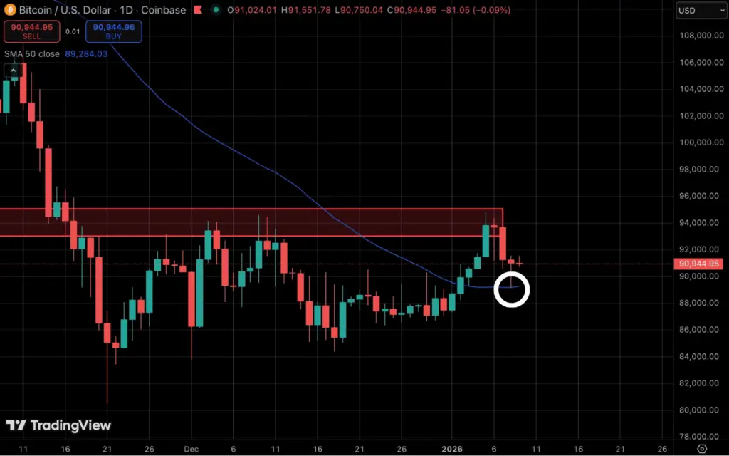 While 2026 has shown early signs of a trend reversal, there are still key levels that need to be reclaimed on the chart. So far, what’s positive is that despite BTC rejecting from the $94K zone, it has perfectly bounced from the 50 day simple moving average, which has acted as support in previous rallies to the upside. In the immediate short term, getting above the $95K resistance and treating this as support will be a crucial catalyst for improving sentiment among traders