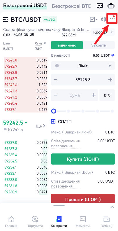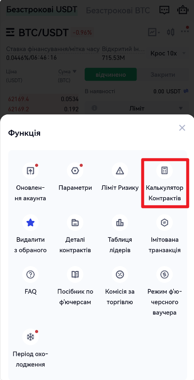 1. Натисніть «…» у верхньому правому куті сторінки ф’ючерсної торгівлі та натисніть «Калькулятор контрактів».