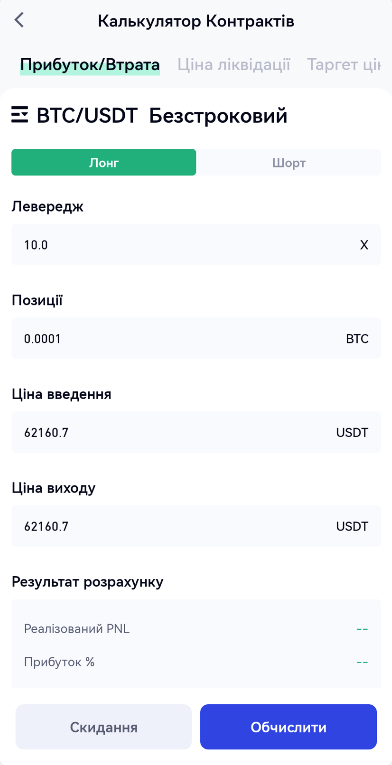 Калькулятор ф’ючерсів може допомогти вам швидко розрахувати прибуток і збитки, ціну ліквідації та цільову ціну.