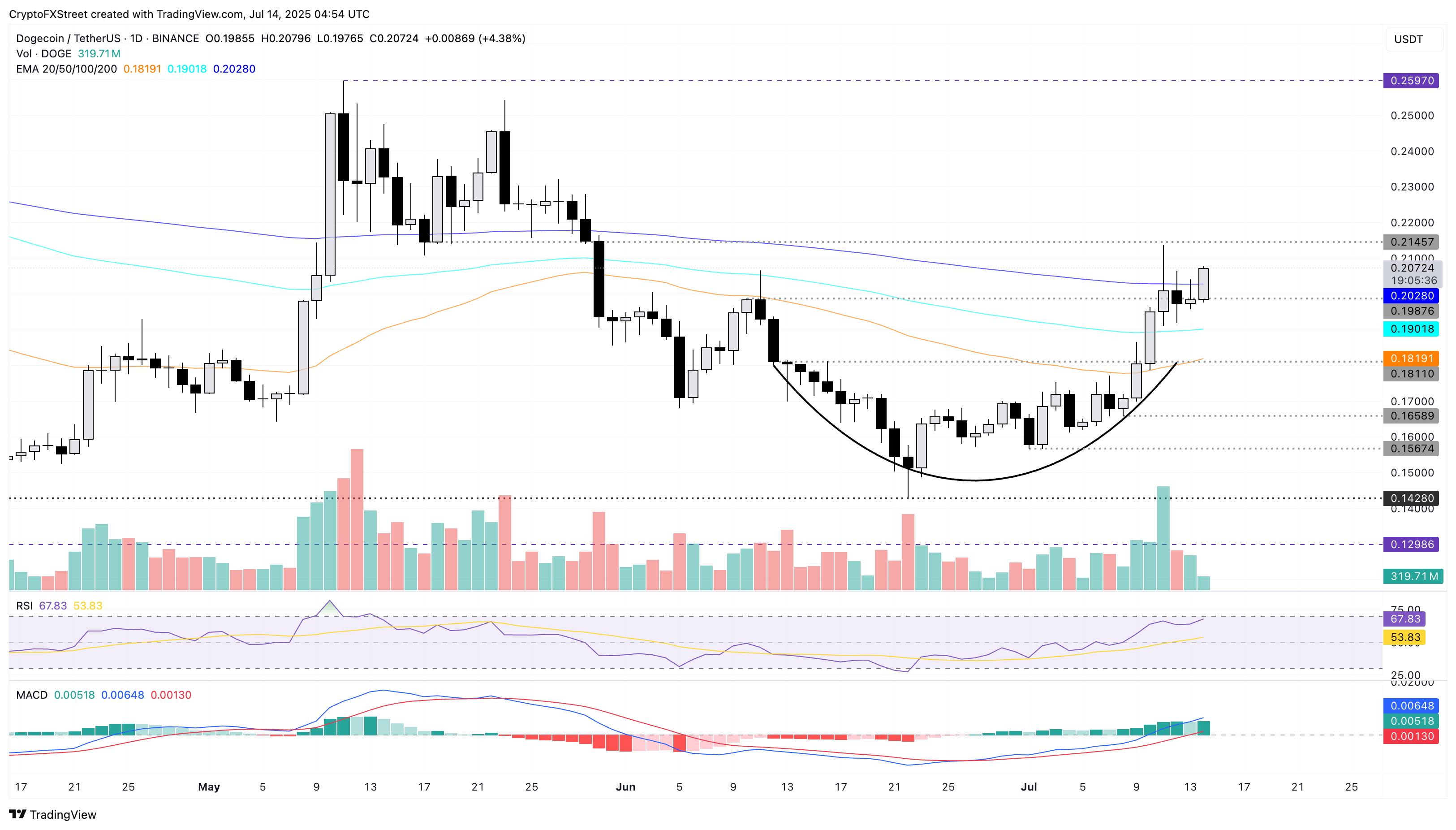 Аналітик FXStreet Вішал Діксіт повідомив, що станом на момент публікації в понеділок DOGE виріс більш ніж на 4% і перевищив 200-денну експоненційну ковзну середню (EMA) на рівні 0.2028 доларів.
