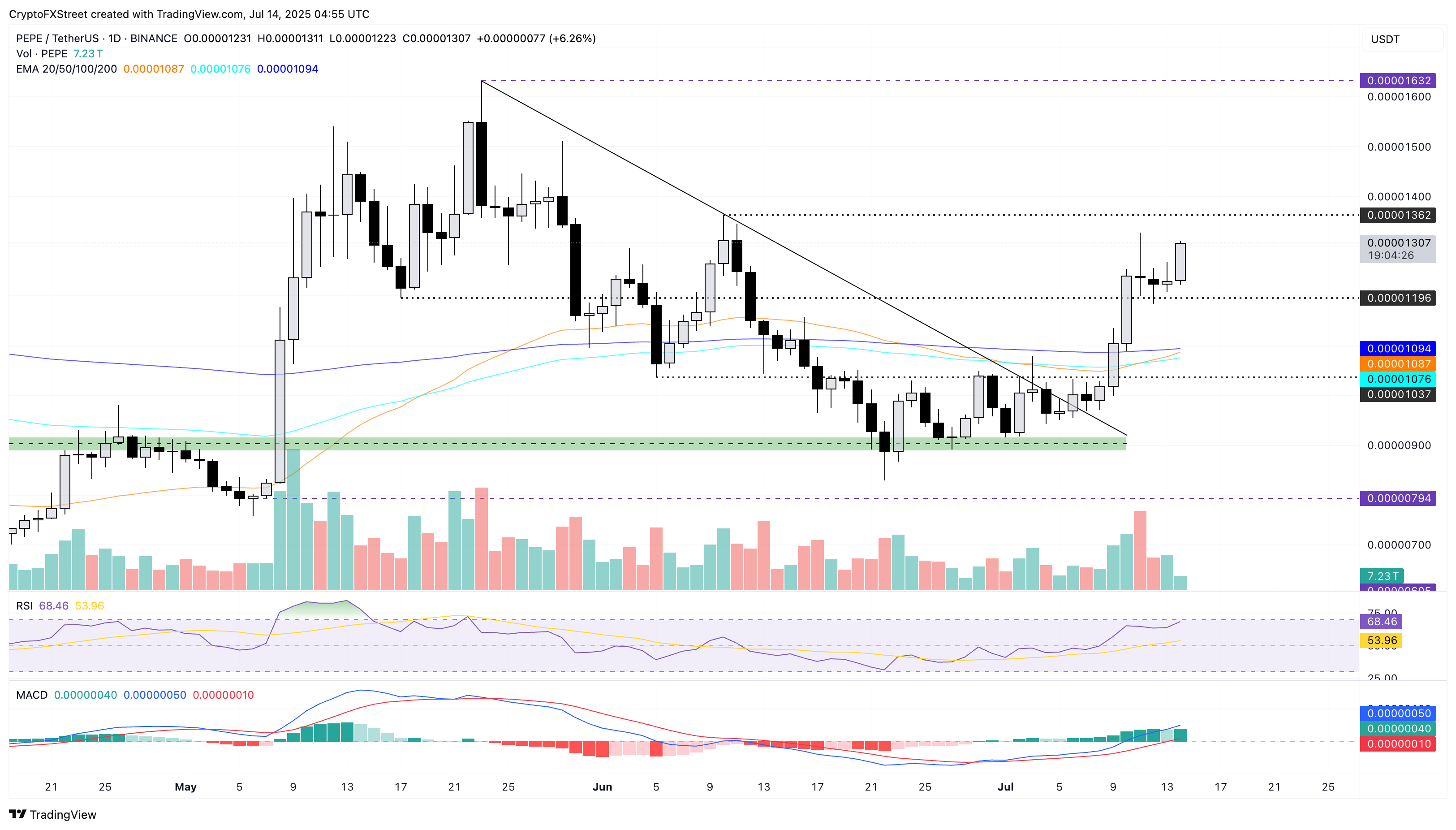 Якщо PEPE突破є рівень опору 0.00001362 доларів, протестований 10 червня, це може розширити зростання до максимуму 0.00001632 доларів 23 травня.