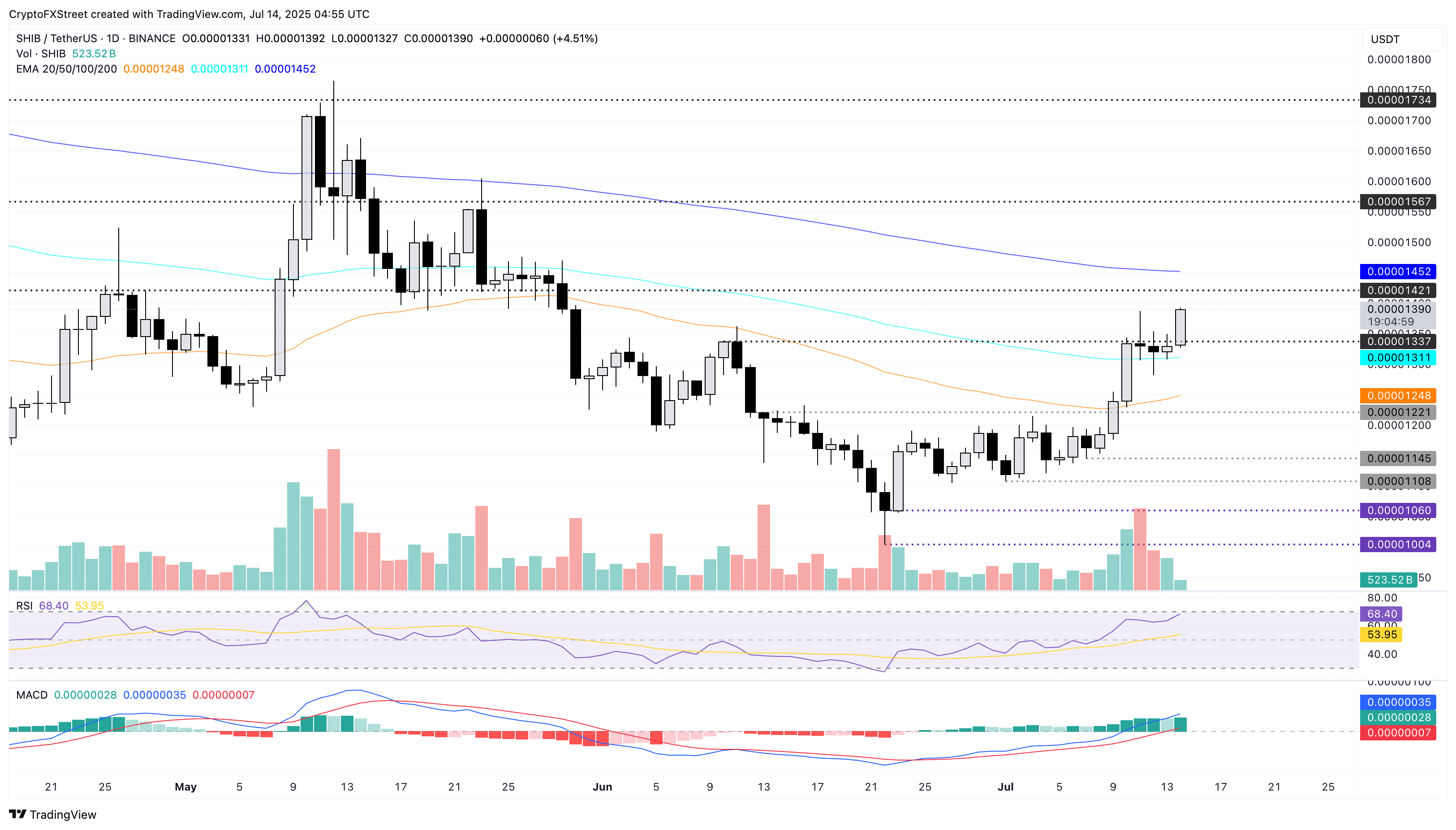 Якщо SHIB відкоригується і закриється нижче 100-денного EMA, то може бути повторне тестування 50-денного EMA на рівні 0,00001248 доларів.