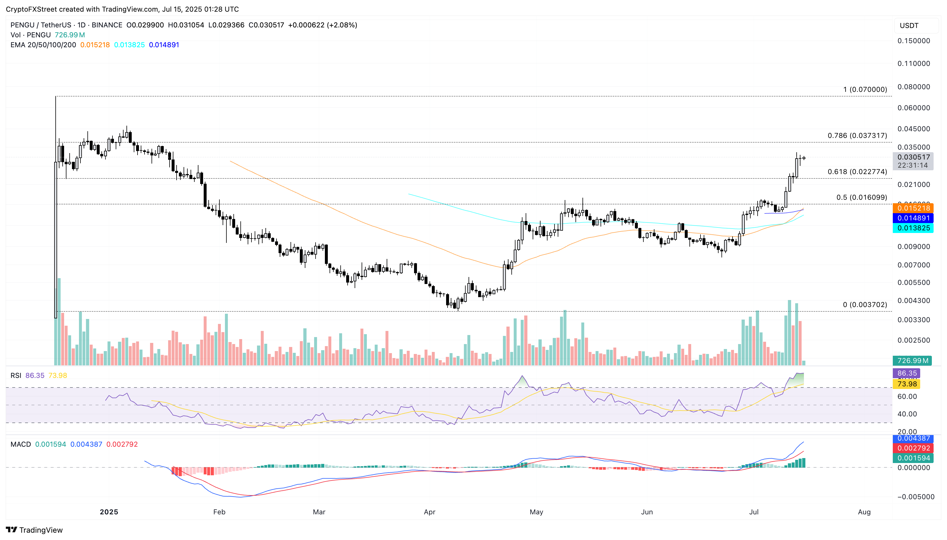 Якщо PENGU не зможе підтримувати цей імпульс, він може повторно протестувати рівень Фібоначчі 61,8% на 0,022 долара.