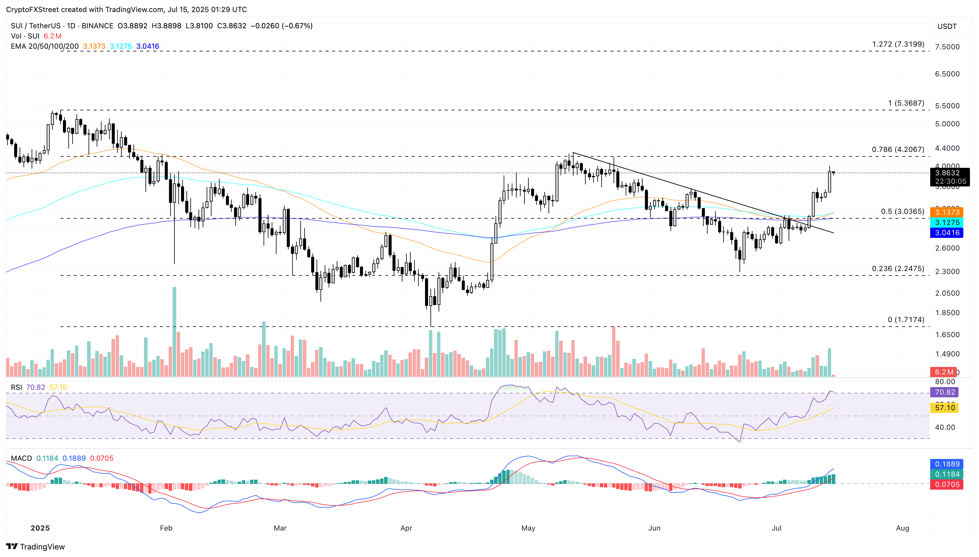 SUI лише на крок відновлення до рубежу в 4 долари, а мета бичачих — 78.6% рівень відкату Фібоначчі на 4.20 долара, цей рівень впав з 5.36 долара 6 січня до 1.71 долара 7 квітня. Якщо вдасться подолати цей рівень, прорив може продовжитися до піку 5.36 долара 6 січня.