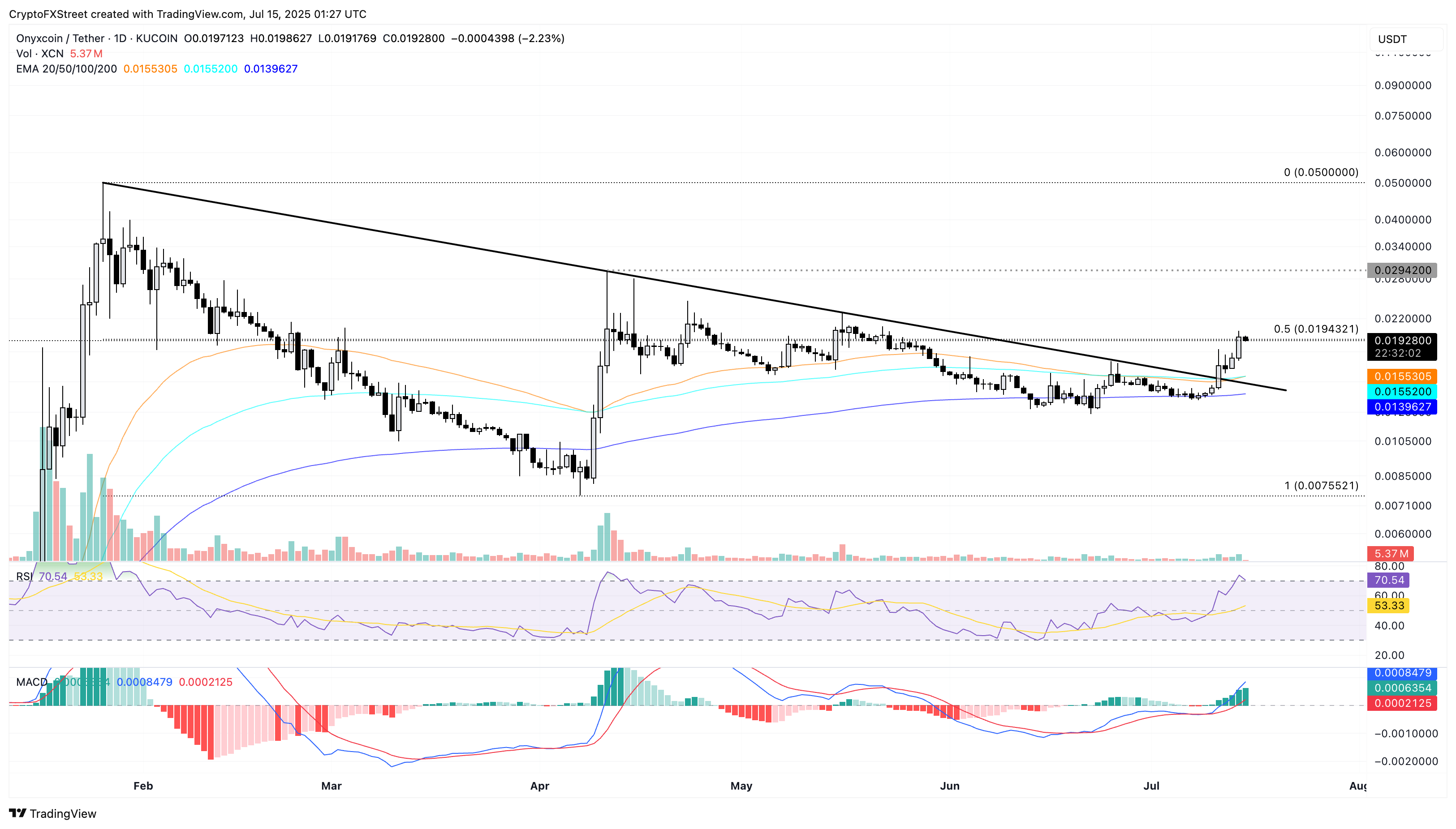 Аналітик FXStreet Вішал Діксіт повідомляє, що станом на вівторок, коли був опублікований матеріал, ціна XCN знизилася на 2%, тоді як попереднього дня вона зросла на 13%. XCN відскочила від 200-денного експоненціального середнього (EMA) і прорвала опірну трендову лінію, що з’єднує піки 26 січня та 16 травня.