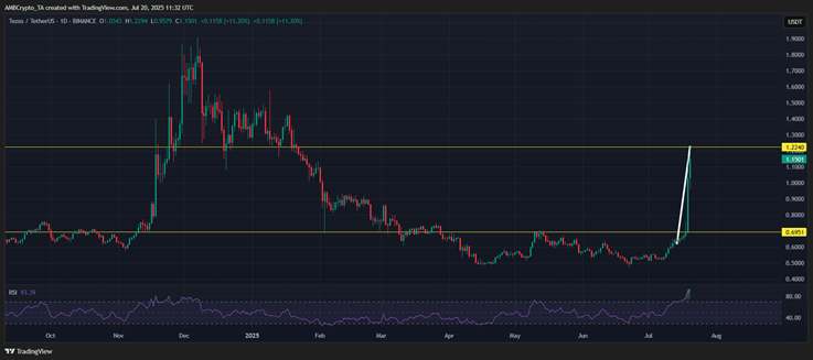Справжній переломний момент настав 19 липня, коли XTZ всього за один день стрибнув на 48,48%, встановивши найсильніший бичачий тренд з листопада минулого року.