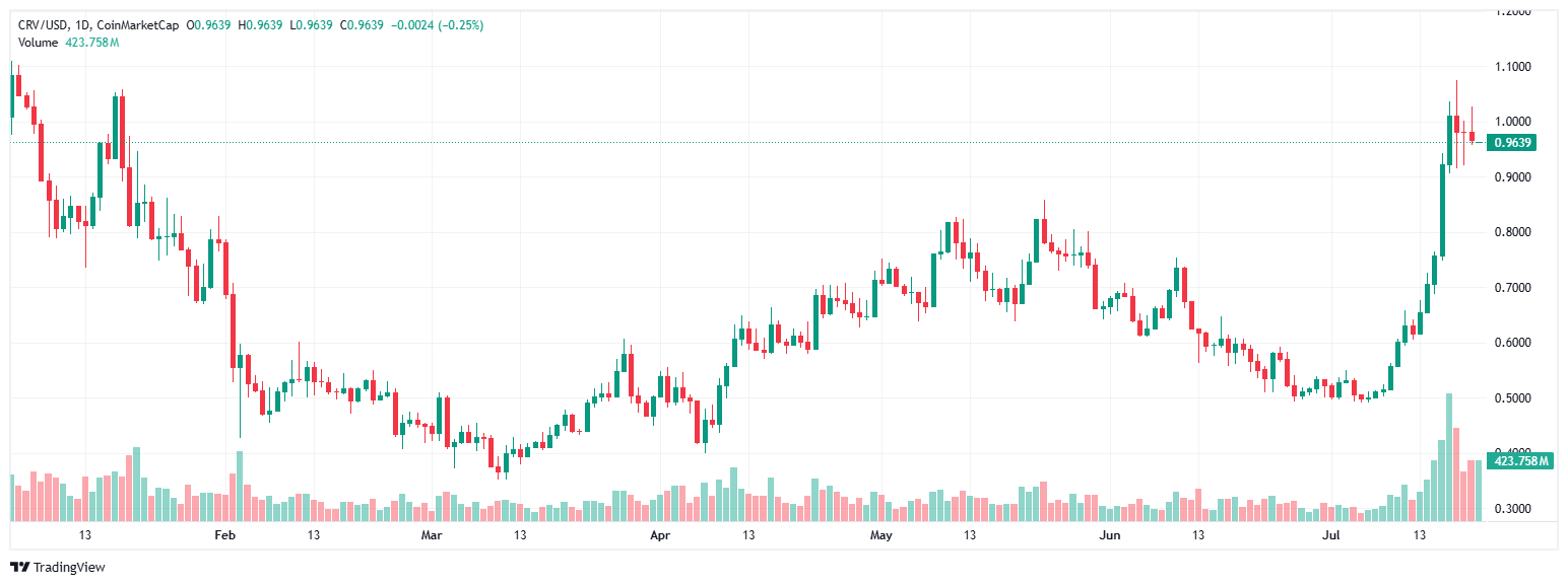 CRV є другою монетою за темпами зростання минулого тижня, піднявшись на 61% від цінового відкриття 0.61 долара.