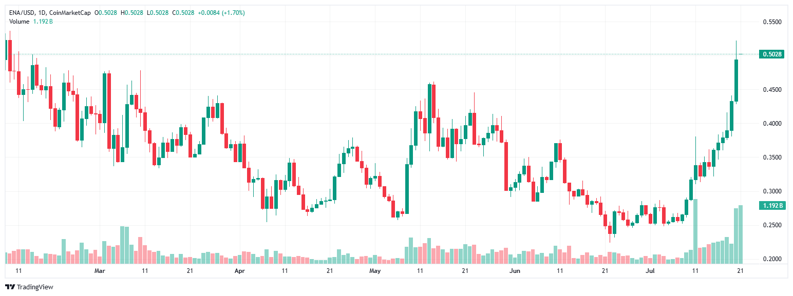 ENA зайняла третє місце на графіку минулого тижня, піднявшись на 56% від низької позначки в 0,32 долара. Цього тижня це очевидна точка повороту на ціновому графіку.