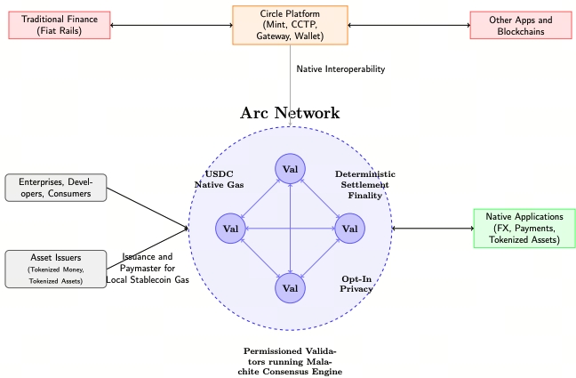 Arc побудований з Circle, існує як незалежна екосистема, вводячи нову архітектуру блокчейну — оптимізовану для фінансів стейблкоїнів з самого початку. USDC як рідний Gas, пропонує низькі, передбачувані витрати в доларах США, без необхідності у волатильних криптовалютах. Це вирішує основні проблеми фінансових команд підприємств: їм більше не потрібно тримати волатильні активи, такі як ETH, SOL, для сплати комісій за транзакції, всі витрати оцінюються в стабільних доларах.